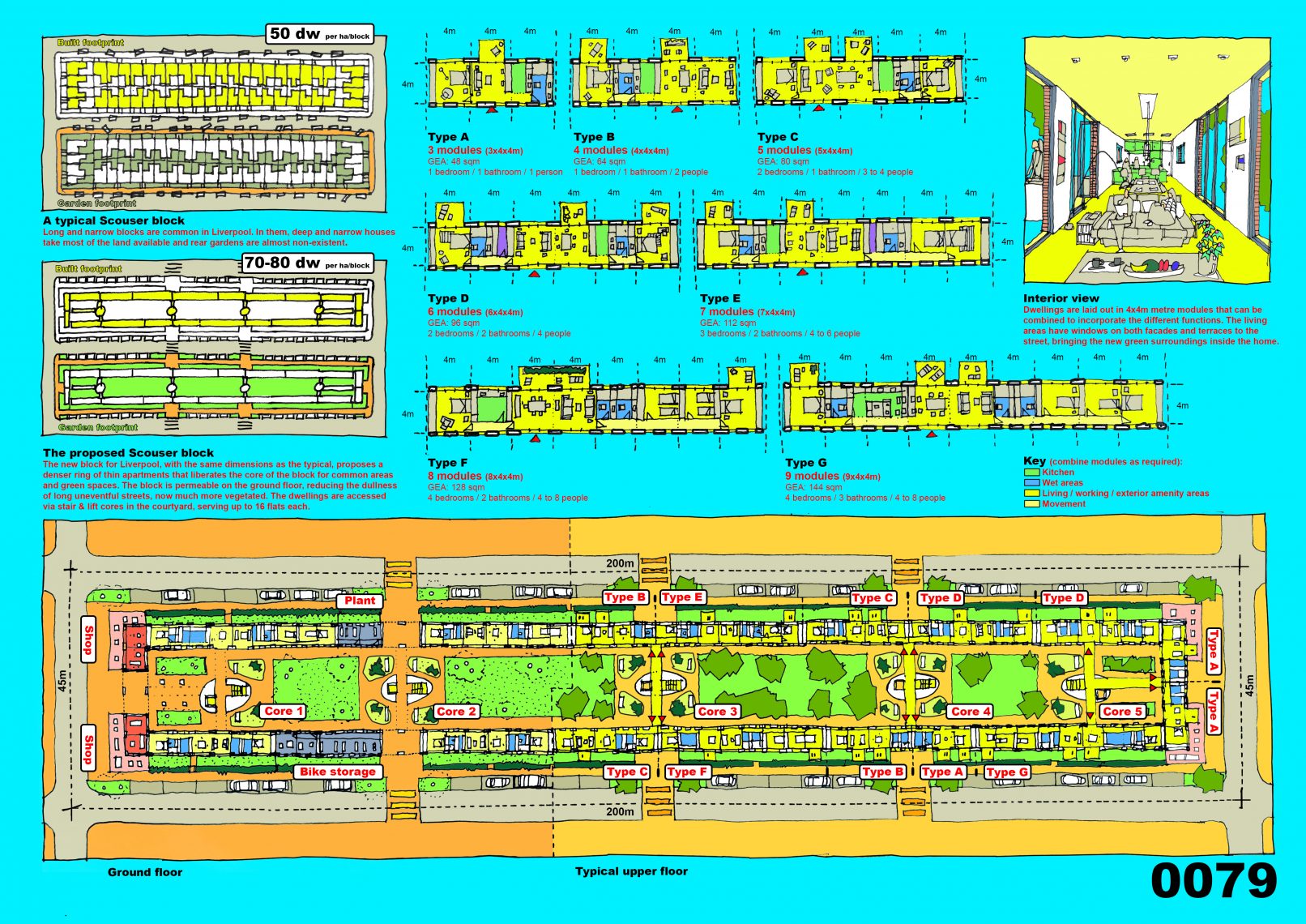 The new block for Liverpool, with the same dimensions as the typical, proposes a denser ring of thin apartments that liberates the core of the block for common areas and green spaces. The block is permeable on the ground floor, reducing the dullness of long uneventful streets, now much more vegetated. The dwellings are accessed via stair & lift cores in the courtyard, serving up to 16 flats each.